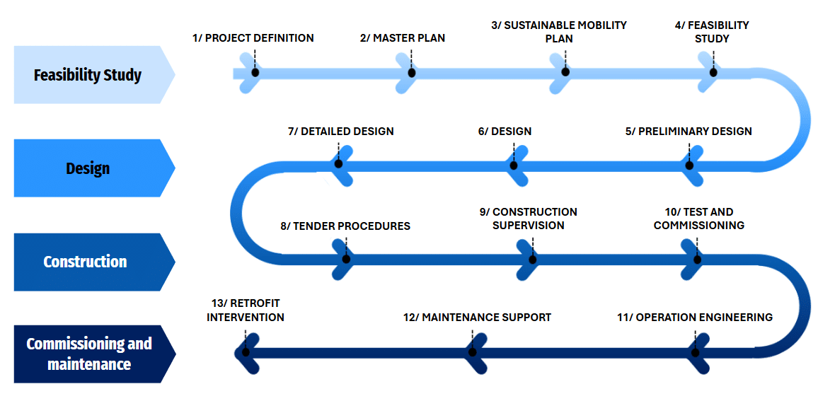 We work across a broad spectrum of transport modes, including light rail, mass rapid transport, high-speed lines and conventional rail, buses, stations and depots, RAMS, rolling stock and cable-cars.