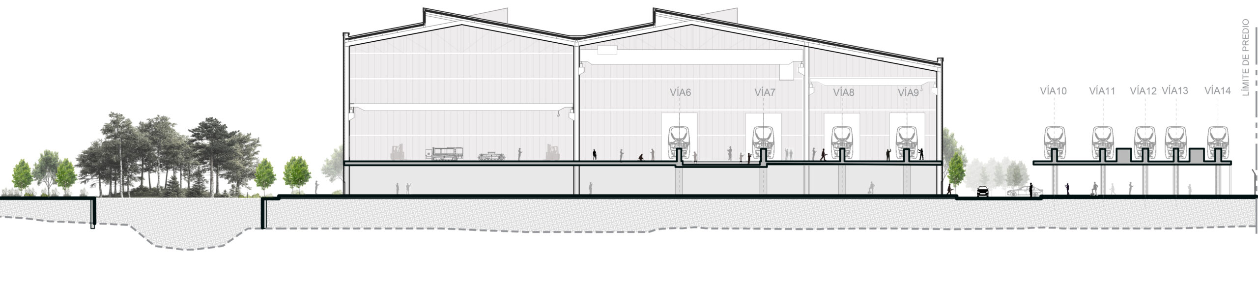 À proximité de l’atelier de maintenance se trouvera la zone des remises avec 4 voies doubles et une voie de lavage. Sous la zone des remises se trouvera le bâtiment administratif et le PCC d’une superficie de 2 600 m². Au nord du site se trouvera le bâtiment de l’atelier de maintenance des véhicules avec trois voies (deux voies de 35 m et une voie de 50 m). Le complexe est complété par une voie d’essai de 350 m de long et des bâtiments auxiliaires pour l’énergie, le PCI, le stockage des déchets dangereux et le PTAR.